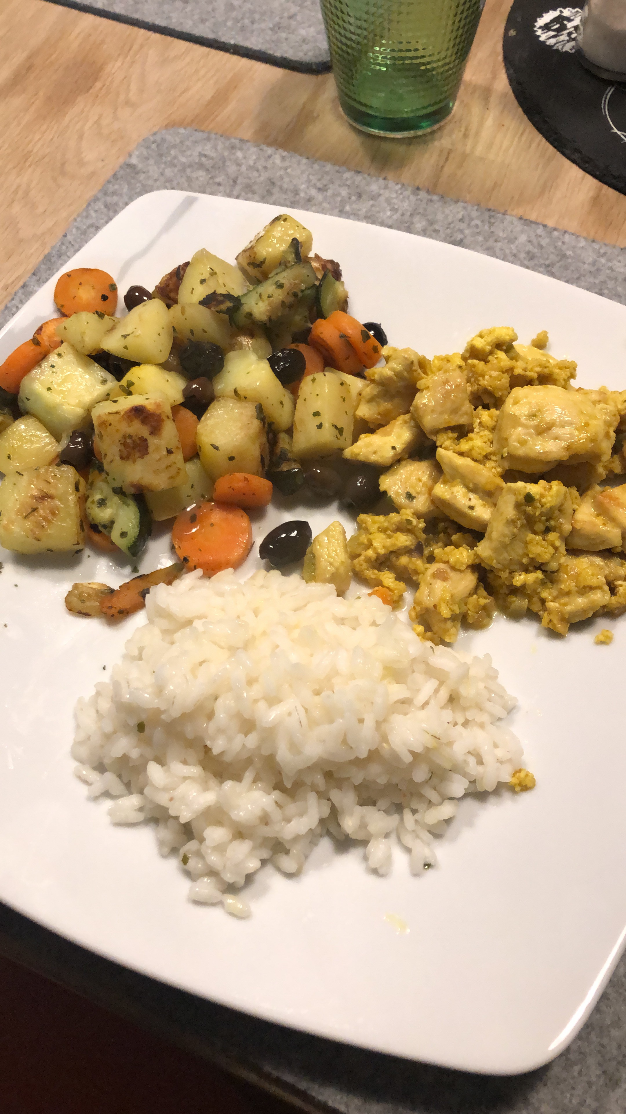 Pollo al curry, riso bianco ( va bene anche quello normale se non avete il basmati) ed un contorno di verdure saltate in padella con un filo d’olio. Il Pollo rigorosamente con yogurt greco!!